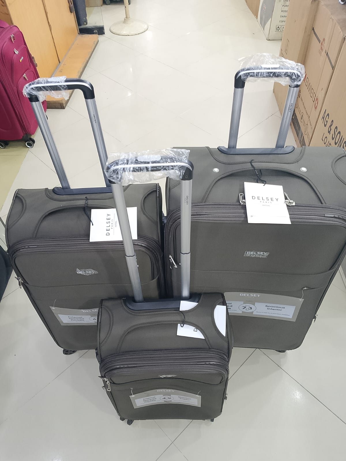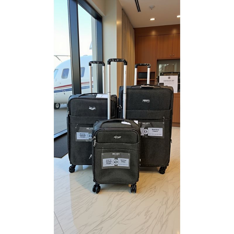 Premium Delsey Soft Side Spinner 3 PC Trolley Set in Pakistan with lightweight design, 360° wheels, and spacious compartments for effortless travel.